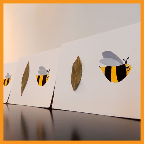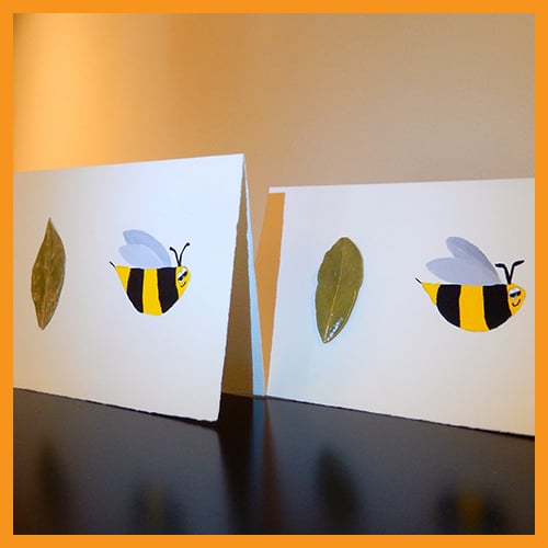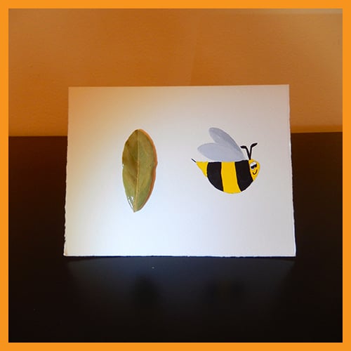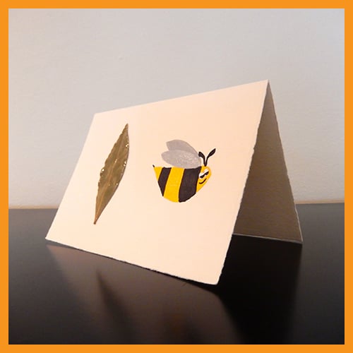 The handmade card is constructed using a bay leaf, graphite, and acrylics on Fabriano Medioevalis Italian paper.