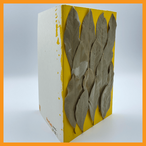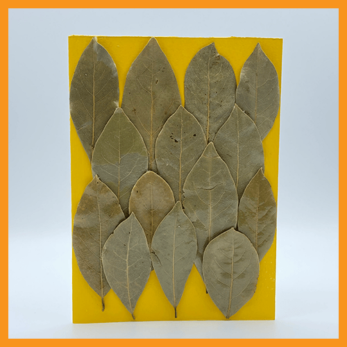 The dimensions are approximately 4.25" x 6". A single envelope is included. The card has been constructed with bay leaves, polish and acrylic on Fabriano Medioevalis Italian paper, and the front design is supported with Plexiglas.